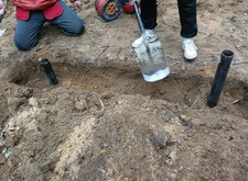 На данном участке изначально присутствовал только простой бетонный памятник и металлическое ограждение. Нам же необходимо было привести территорию могилы в полный порядок. Приступая к работе, мы первым делом вкручиваем определяющие фундамент сваи.